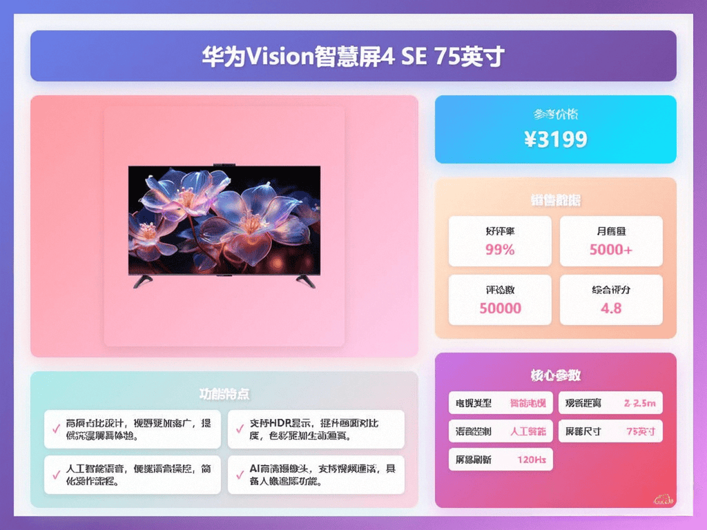 五、华为热销款:华为Vision聪慧屏4 SE 75英寸 (京东参考价:3199)这款电视内置酷开系统。